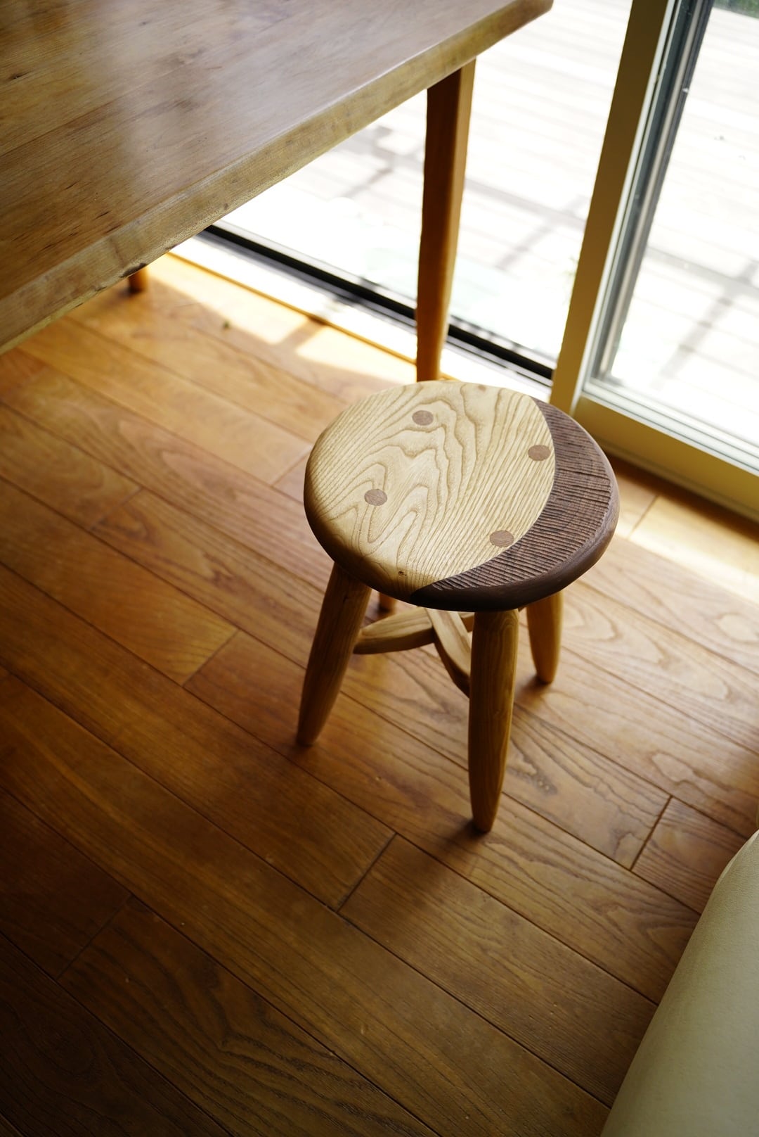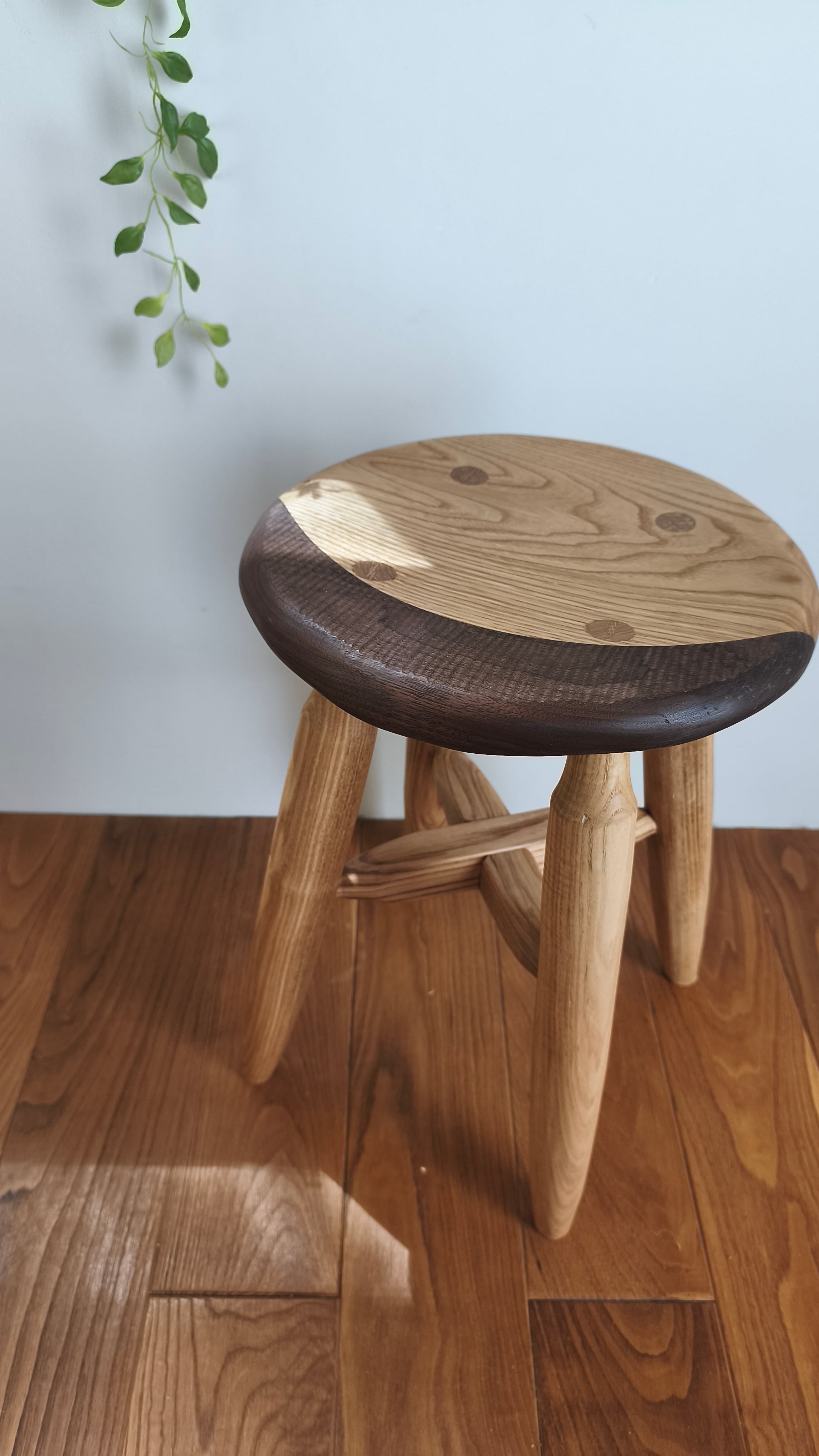 くりの木とブラックウォルナットの寄木スツールです